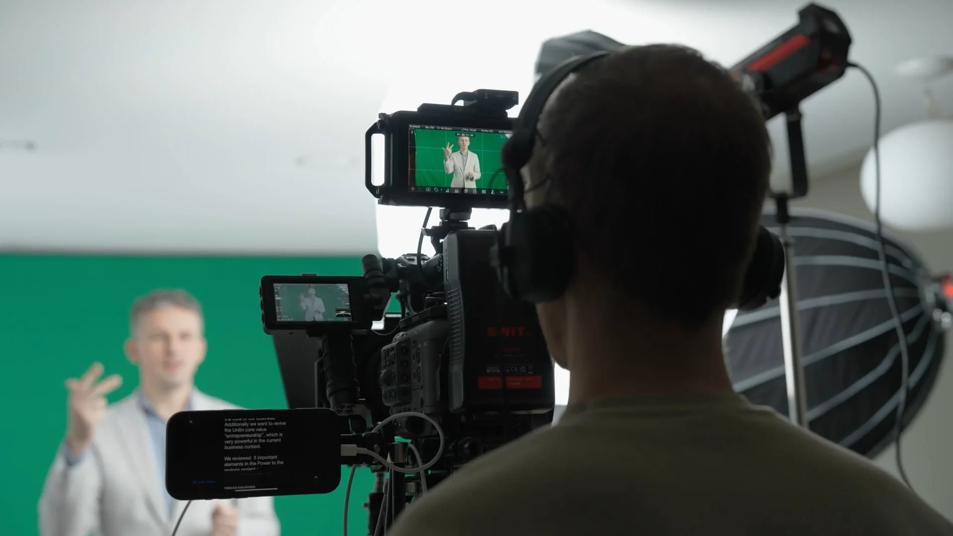 DJI Mavic 3Elk kwartaal hetzelfde ritueel: teleprompter, greenscreen, verlichting.